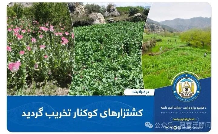 5月7日,阿富汗内政部报道称,阿富汗警方继续摧毁毒品种植,拉格曼的阿林加尔、阿里尚和Qarghiu县476英亩的罂粟粟种植园,巴格兰省49英亩,卡比萨省6英亩,萨尔普尔省3英亩,库纳尔3英亩,Daykundi省超过1英亩、Samangan省2,400平方米土地和赫拉特8,000多平方米土地的罂粟已被清除。