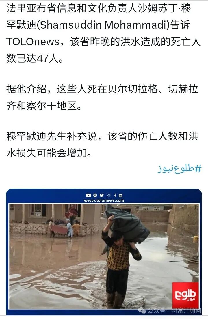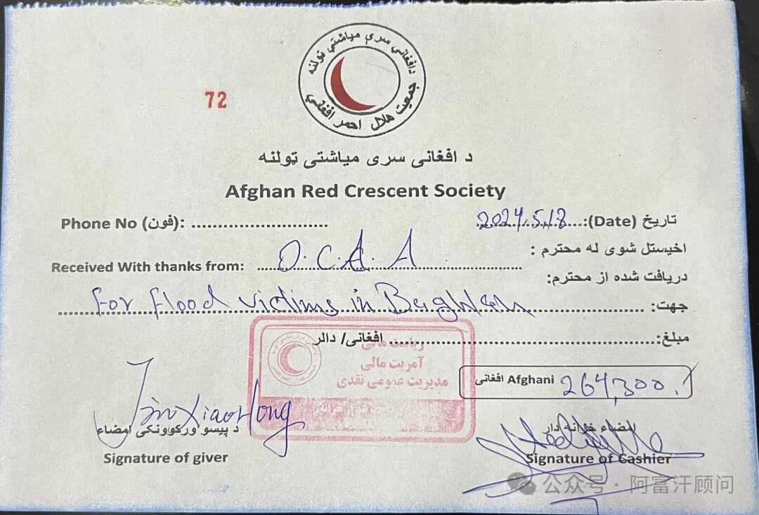 阿富汗华侨华人协会(OCAA)成员16日抵达巴格兰省洪灾区,向当地儿童捐赠了羊肉、面条等生活物资。该协会18日又向阿富汗红新月会捐款,协助灾区赈灾。阿富汗华侨华人协会会长孟晓丽表示,在困难面前,中阿人民心连心,肩并肩。此次总共募捐收入358700阿尼,捐赠巴格兰孤儿院92308阿尼,余额264300阿尼捐赠给阿富汗红新月用于巴格兰水灾救助。