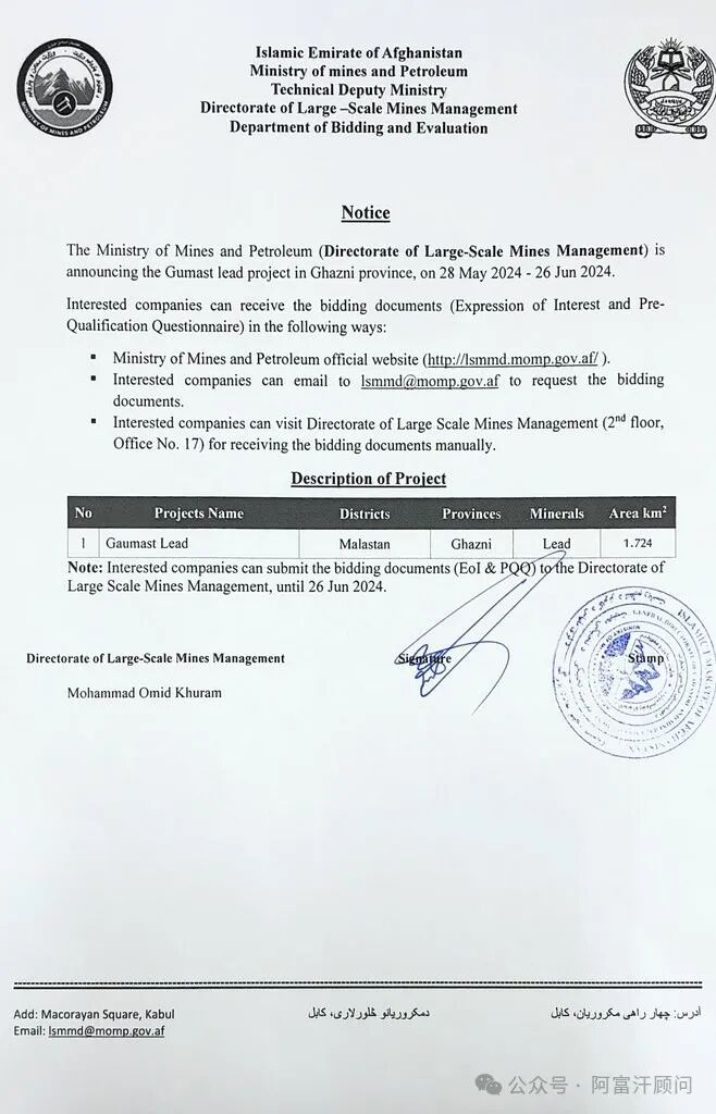 日前,阿富汗矿业和石油部宣布对加兹尼省Malastan县一处铅矿公开招标。
