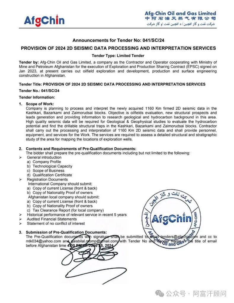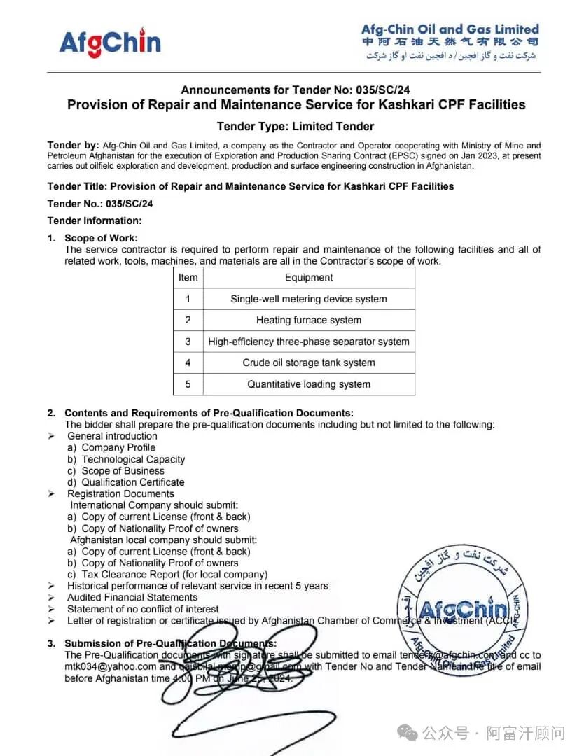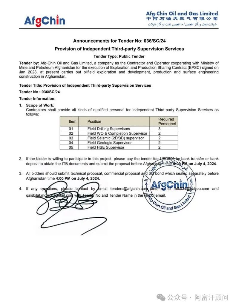 阿富汗矿业和石油部公告了阿姆河油田承包商的若干服务采购招标,有意向的企业注意投标截止日期。