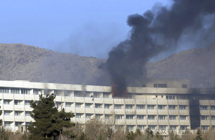 (2018年1月21日,阿富汗喀布尔发生袭击事件后,男子试图从洲际酒店的阳台上逃跑,距离塔利班收复该国还有两年半的时间。持枪歹徒冲进酒店,与安全部队展开了长达12小时的枪战,持续到周日上午,疯狂的客人试图从四楼和五楼的窗户逃生。)
