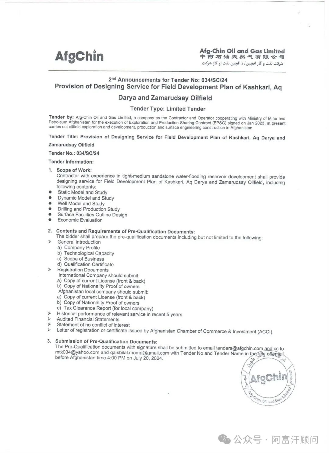 7月9日,阿富汗矿业和石油部公告,再次对阿姆河油田三个合同区块的开发方案设计公开招标。