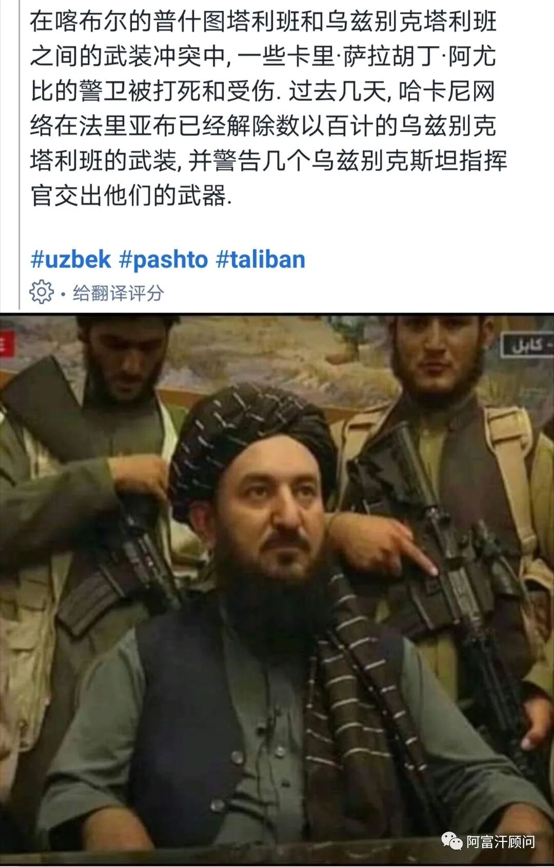 今日,有社交媒体爆料称,阿富汗塔利班内部民族派别间发生纷争,但是不清楚乌兹别克塔利班是指内部民族派别还是其支持者乌伊运武装分子。