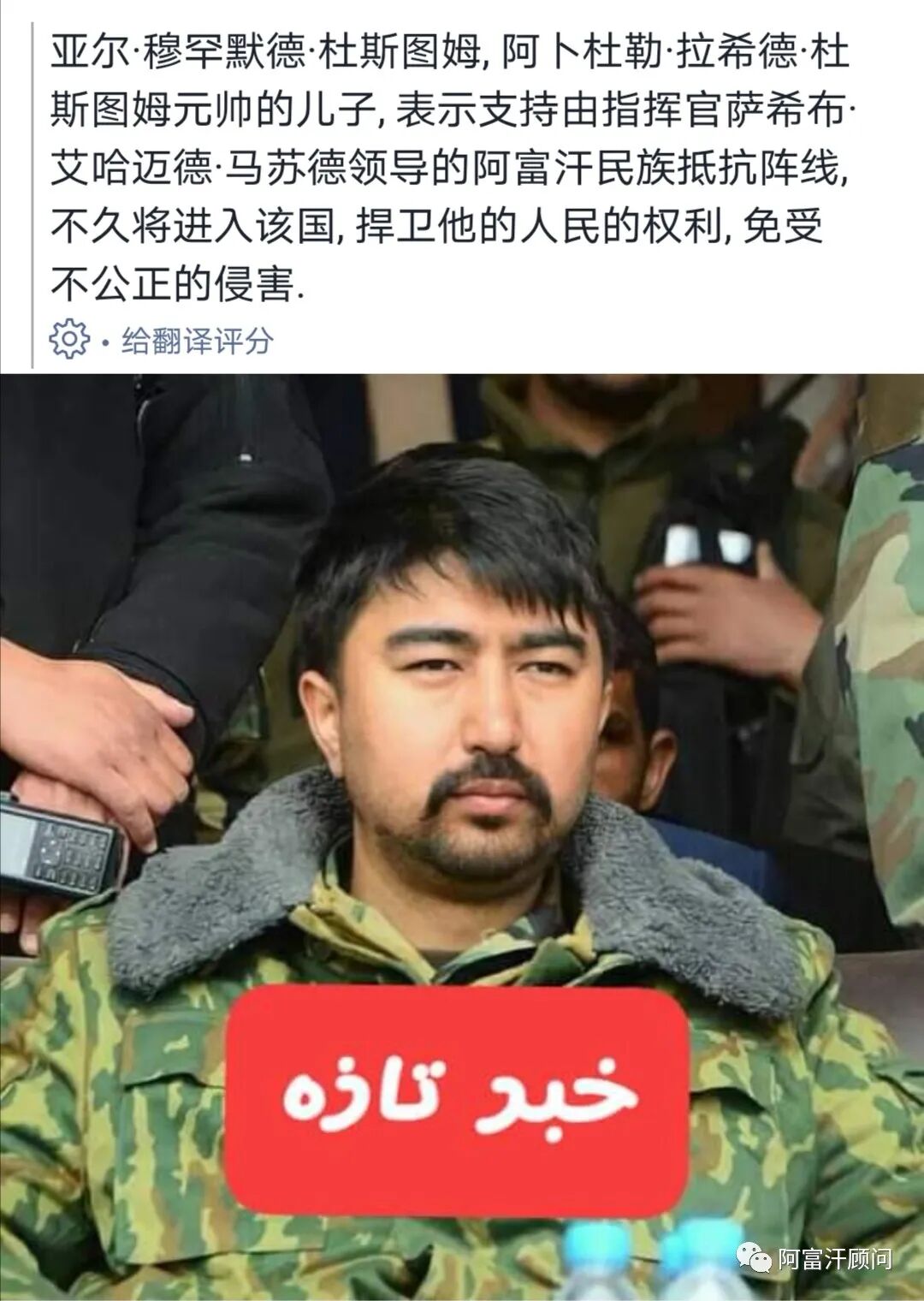 较早前,社交媒体上称,乌兹别克族人的势力代表人物巴图尔.杜斯塔姆表示支持小马苏德领导的民族抵抗阵线。