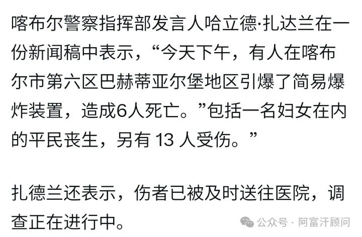 9月2日,阿富汗警方公告,首都喀布尔当天下午发生一起自杀式爆炸袭击事件,造成除袭击者外6人死亡、13人受伤。