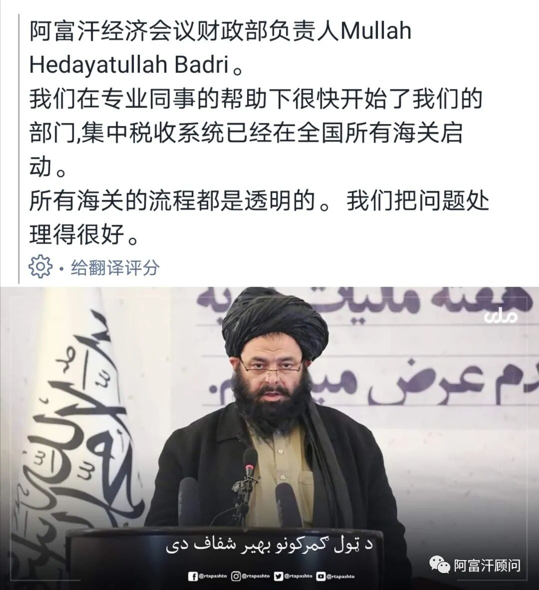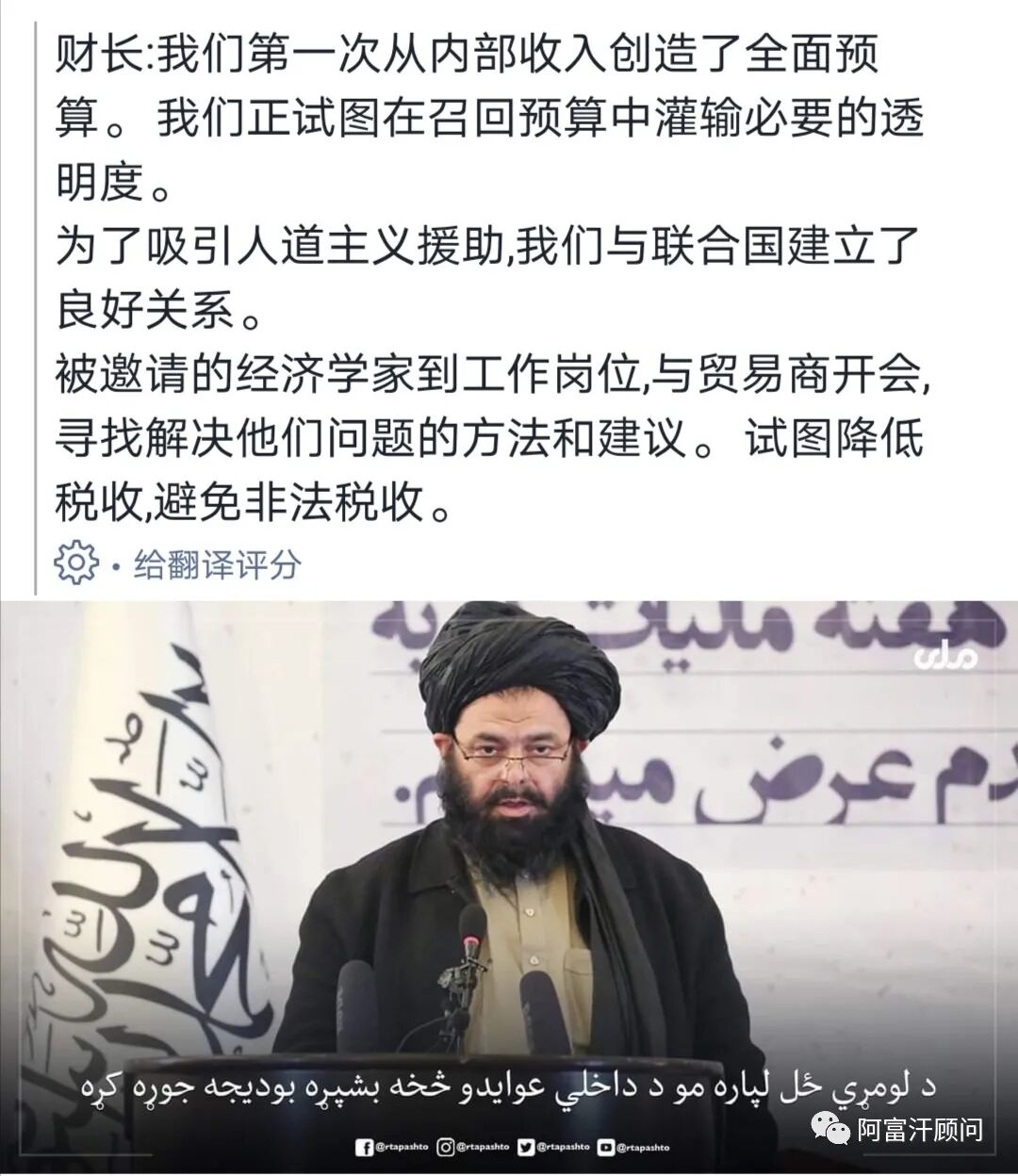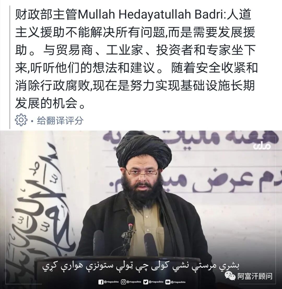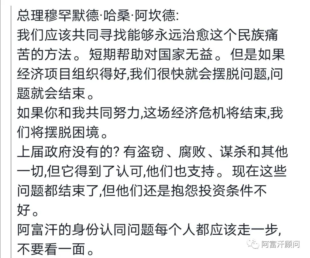 另外,他还表示:公平和发达的经济需要什么?1. 安全的环境:现在的阿富汗全境都是安全的。 2. 根除政府腐败 。3.平衡的薪资:国家降低了这方面的高薪。(劳动力成本价格低) 4: 正统和公平的伊斯兰制度。(以上都为阿富汗发展经济创造了有利条件。)