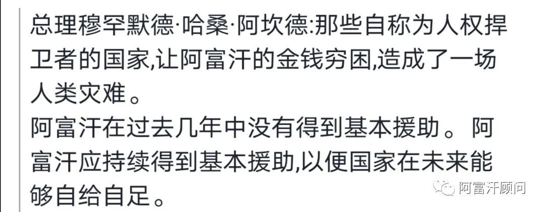 主管经济的阿富汗副总理Mawlawi Abdul Salam Hanafi表示:我们不想要与援助相关的经济,也不希望将国家经济与援助联系起来。我们正在与国际社会协调并重新启动项目。阿富汗不能总是依赖援助,我们需要一个以国内发展和自给自足为基础的经济。