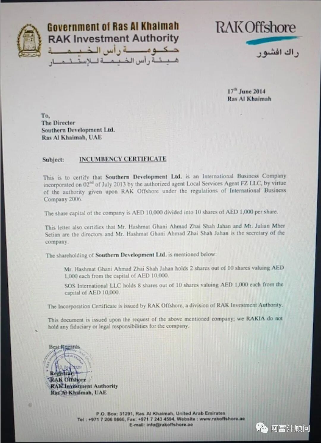 第四章 南方开发公司的幽灵老板除了与美国有着强大的联系外,SOSi在发展方面处于有利地位,因为它不怕脏。在他的论文中,哈特威格建议向阿富汗政府提供“某种形式的利益”,以赢得“关键领导人”对未来矿产项目的支持。通过其子公司,SOSi正是这么做的,显然是让总统的兄弟参与了这笔交易。南方发展公司是一个复杂的大杂烩,从阿富汗延伸到阿拉伯联合酋长国,但其核心是SOSi和Hashmat Ghani的合资企业。一份2005年的喀布尔商业目录和其他档案文件显示,哈什马特·加尼是南方发展公司的最初所有者。在阿拉伯联合酋长国秘密管辖的Ras al-Khaimah海上自由区,一份南方开发公司的文件证实,2014年6月17日,也就是最终导致Ashraf Ghani当选总统的投票三天之后SOSi拥有该公司80%的股份,Hashmat Ghani拥有剩余股份。