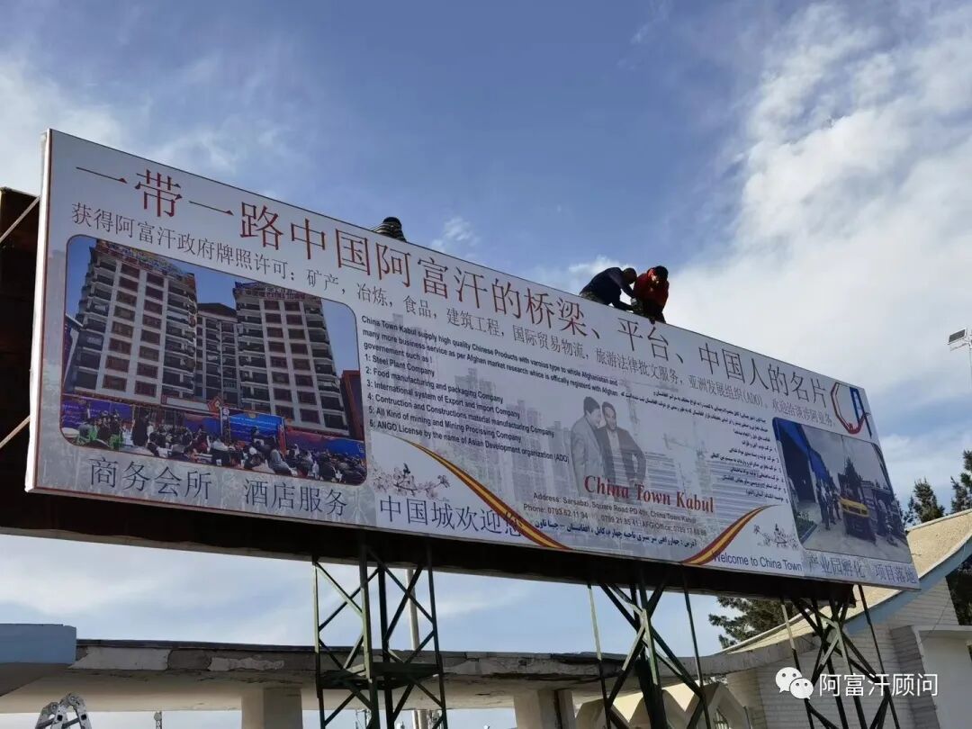 (图片说明:喀布尔中国城在机场候机楼广场树起第一幅中国特色巨幅广告牌)