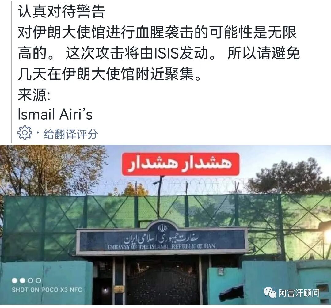 近日,有媒体不继炒作阿富汗难民在伊朗受到当地官员虐待事件,引起阿富汗人高度关注,一度导致二国关系紧张。有社交媒体预警,近期可能有武装分子对伊朗驻阿大使馆发动血腥袭击。