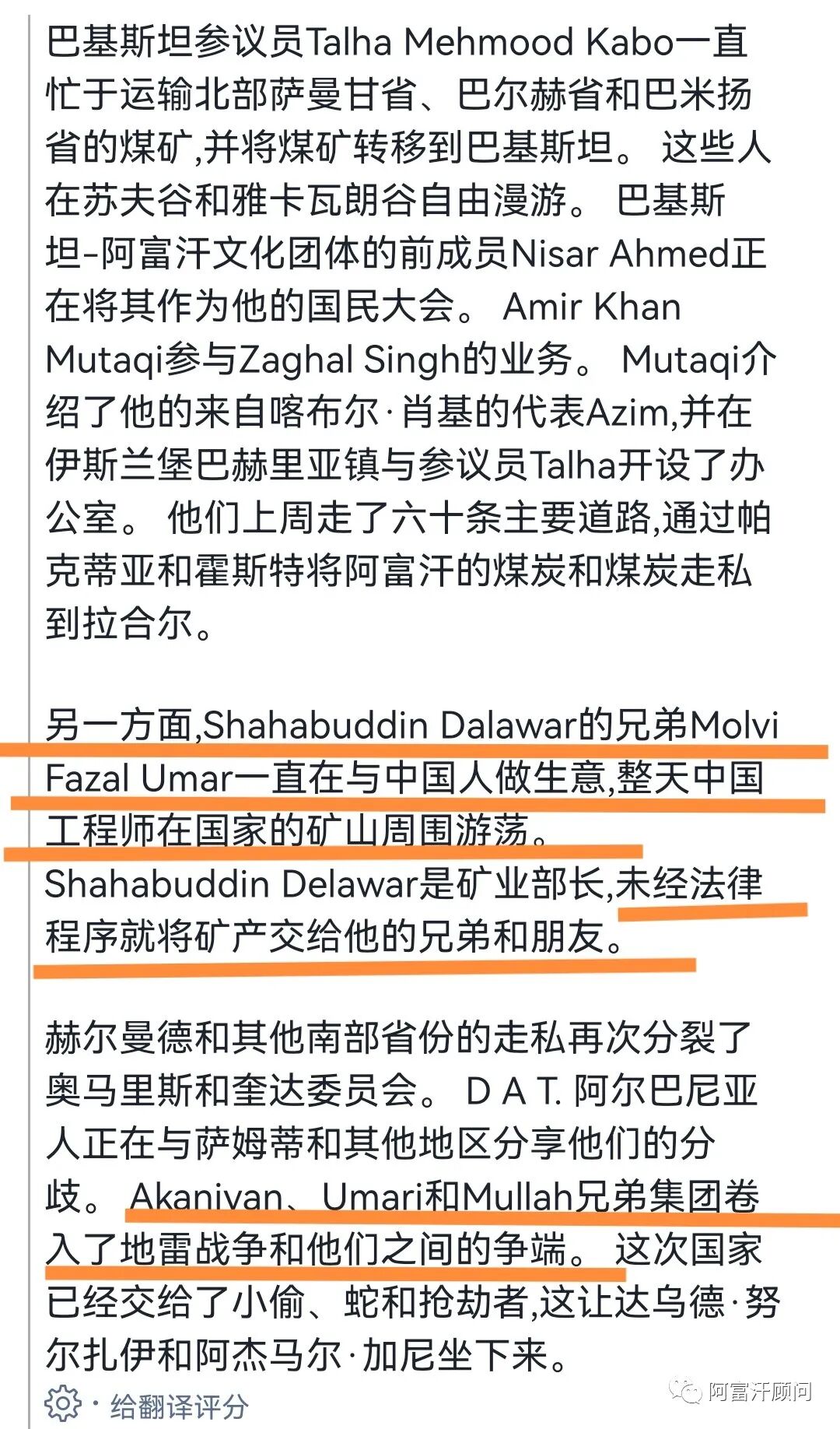最近阿富汗当地民众纷纷传言给阿富汗顾问,有人将阿富汗的煤廉价外运倒卖到中国,现在几乎所有的大卡车都在拉煤,每天有上百辆运煤车在阿富汗的公路上跑。阿富汗顾问对此一直表示,将煤运往中国这不可能,因为运费明显不合理。今日,某阿富汗名人在社交媒体上披露了当前的阿富汗矿争,值得引起目前试图在阿富汗“捡漏”的中国人警惕。据阿富汗顾问实地接触一些地方官员观察,对前段时间一些中国人在阿富汗表现出的拿矿热情,一些官员已经颇有微词甚至语出不逊!