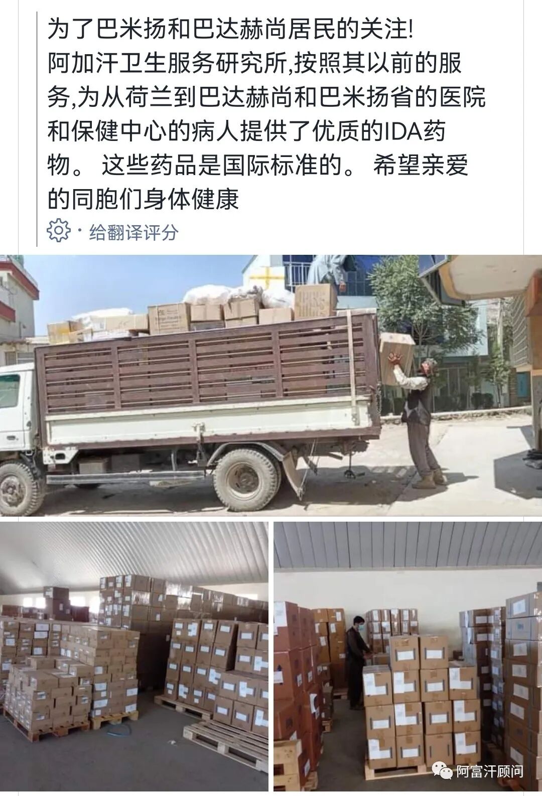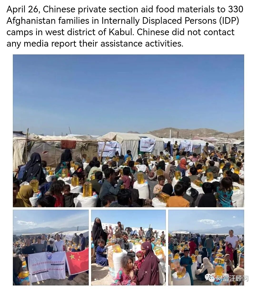 4月26日,一家中国民营企业自发组织慈善活动,在喀布尔西郊的流离失所者营地给330户贫困家庭捐赠粮油生活用品。据该企业负责人称,他们已经组织过数次民间捐赠活动,后续还将继续组织捐赠当地贫困户的类似活动。4月27日,该企业又组织了捐赠活动。阿富汗顾问建议,在阿富汗进行此类慈善活动应通知当局主管部门和宣传机构后,有序进行为宜。