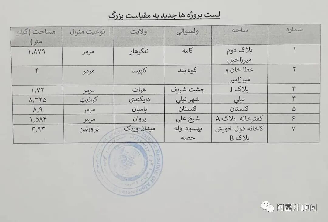 昨天(5月18日),阿富汗矿业和石油部又拿出了7个矿招标,包括5个大理石矿1个花岗岩矿和1个石灰矿。按矿区面积超过1平方公里来划分,上述7个矿为大规模矿。