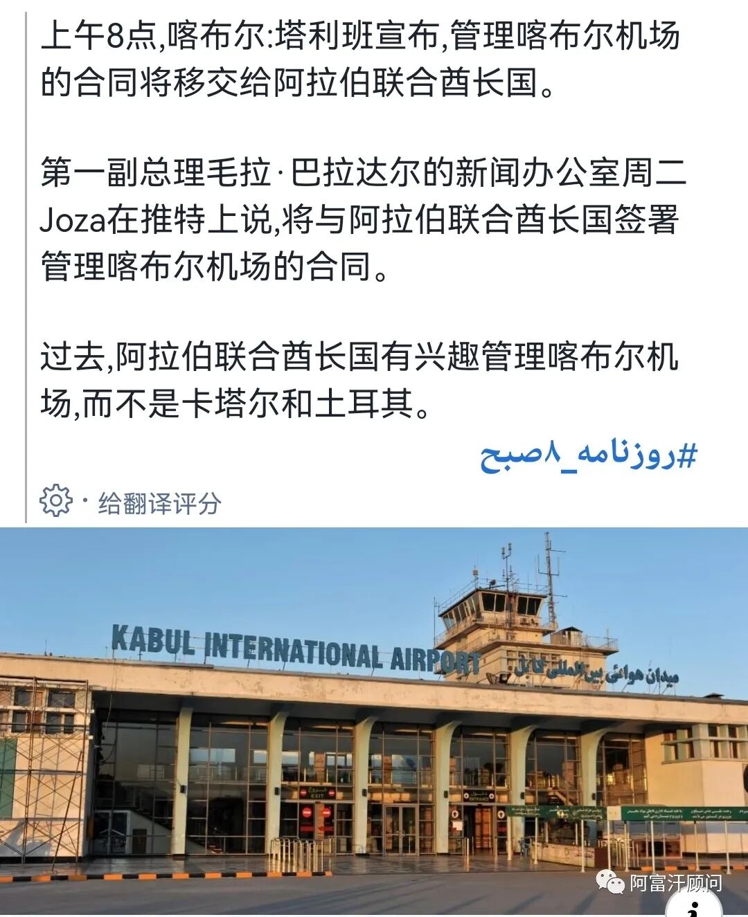今天(星期二),阿富汗民航局( A CAA )表示,该国与阿拉伯联合酋长国( UAE )于周二签署了该国四个机场的监管和管理合同。该协议由运输和航空部代理部长Hamidullah Akhundzada和阿联酋财团GAAC的首席执行官Razzaq A Slam签署,负责经济事务的副总理毛拉.阿卜杜勒·加尼·巴拉达尔和信息和文化部代理部长毛拉.海鲁拉·海尔霍瓦等政府官员出席了签字仪式。此前外界报道塔哈尔和土耳其一直意向争取签署合同呼声很高,最后阿富汗当局却选择了阿联酋。阿富汗顾问注意到,很多国人常常理解为阿富汗急需要投资,以为是买方市场,殊不知阿富汗很多领域却是卖方市场,包括资源领域,并不是只有中国一个买家,消极观望最后只能是被竞争对手抢占先机。