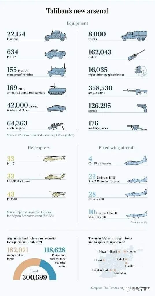 美国人留给阿富汗塔利班的军火库(图片来源于网络)。面对这些以前依赖美军承包商维护保养的先进装备,美国人走了,阿富汗人怎么办?
