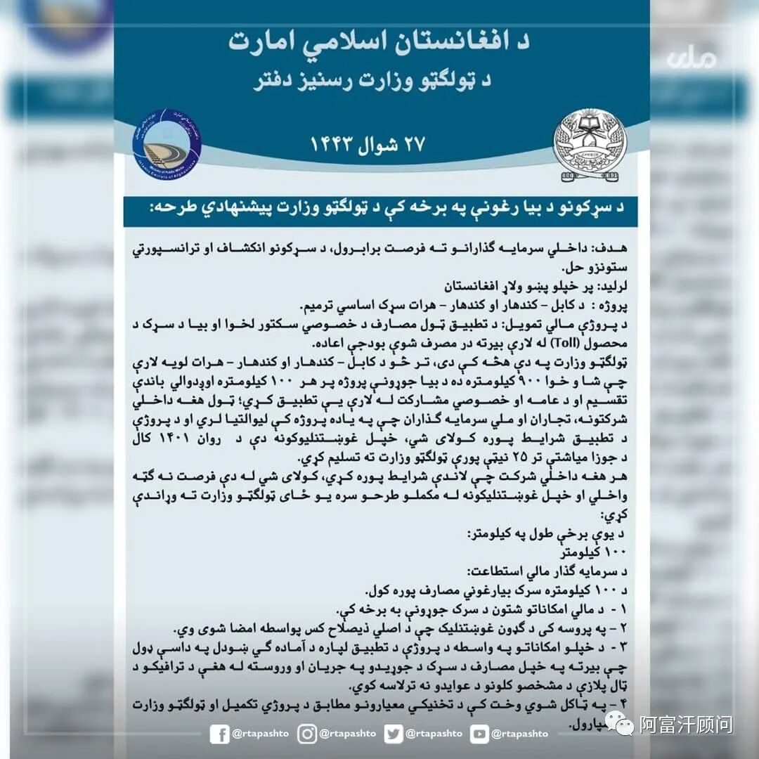 读者询问本公众号上篇文章中有关900公里公路重建相关问题,阿富汗顾问的员工专门咨询了阿富汗公共工程部。据了解,该项目目前划分为9个标段,每个标段100公里,以收费权换投资,凡是有实力有资金预算可执行项目的阿富汗本地公司均可参与,外国公司如何参与并未明示,当地商业惯例,一般可以JV形式签署合同和执行项目。另外还有若干优惠条件,有兴趣的单位具体可以与阿富汗顾问咨询合作。阿富汗顾问有必要再次重申的观点和提醒有意向的中国投资者,阿富汗重建进程中的机会绝对不是买方市场,而是卖方市场。任何投资机会都可能会面临来自周边国家譬如土耳其、伊朗、印度、巴基斯坦、俄罗斯还有中亚等国甚至西方国家资本的竞争。