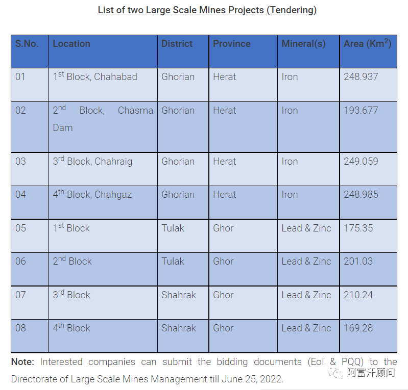 今天,阿富汗伊斯兰酋长国矿业和石油部(大规模矿山管理局)公告,于2022年4月21日宣布招标的二个大型矿山项目,根据部长阁下的指示,招标延长 20 天至 2022 年 6 月 25 日。有兴趣的公司可以通过以下方式收到招标文件(意向书和资格预审问卷):(以下略)