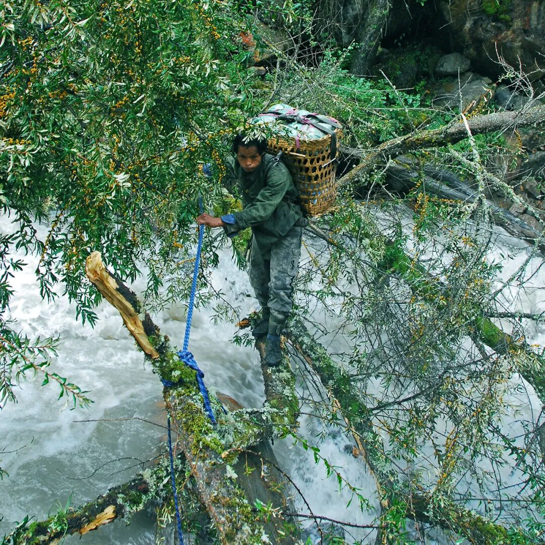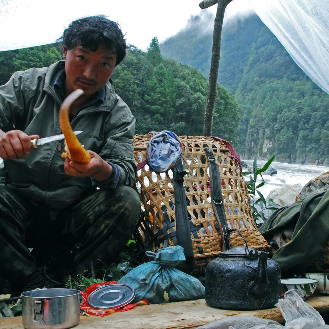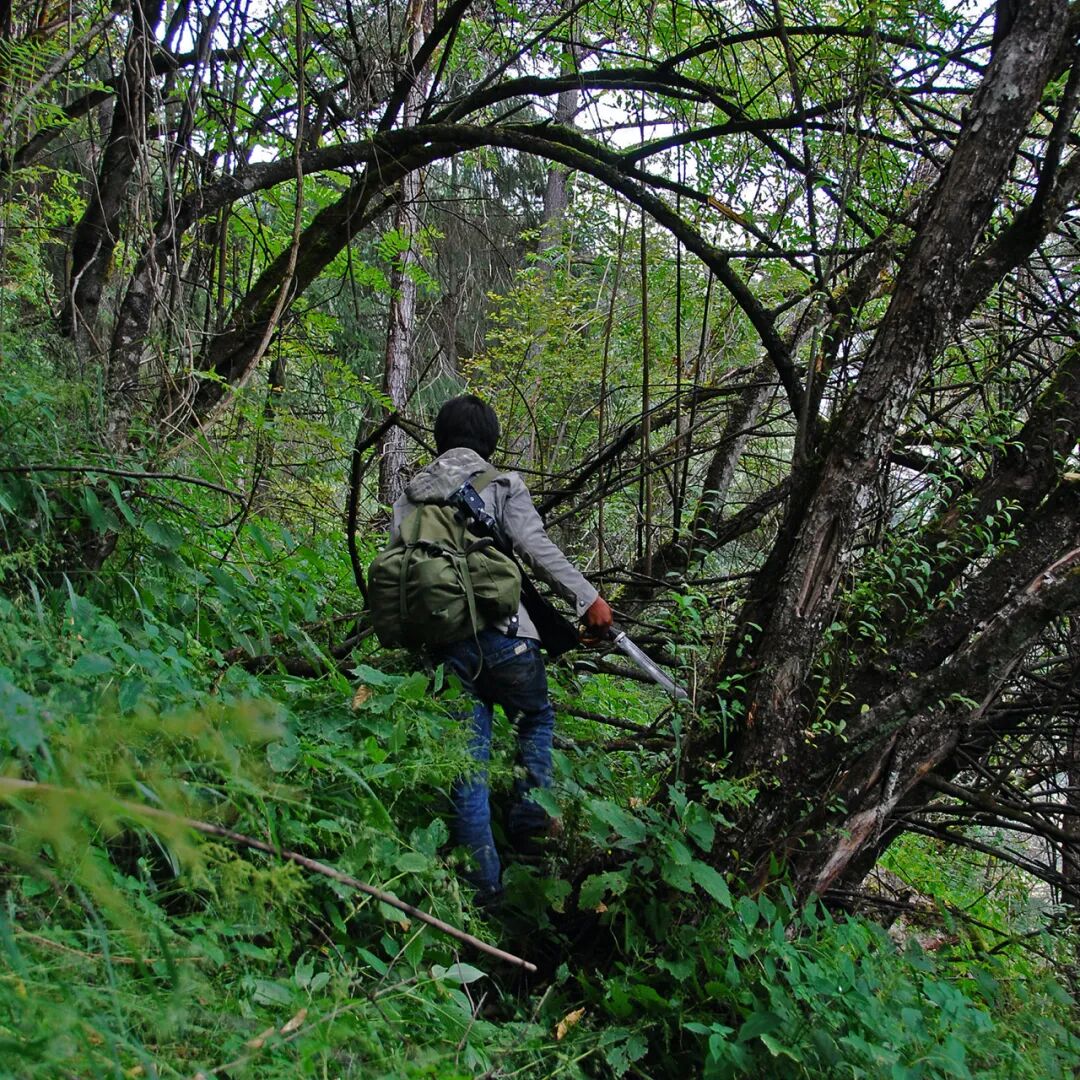 这是我和多杰两个人的旅行,他行路极快,无视跟随的我。在这种一对一的向导关系中,彼此间的博弈更微妙,显然,多杰是碾压级的存在。常常,他在前方密林中穿梭,不见身影,我频频呼喊他的名字,然后根据他的回音判定方向。有时完全没声音,不知是他没听见,还是故意,我就只能靠直觉跟随了。这在弯腰系个鞋带都易迷失的复杂丛林里,实在太难为人了。
