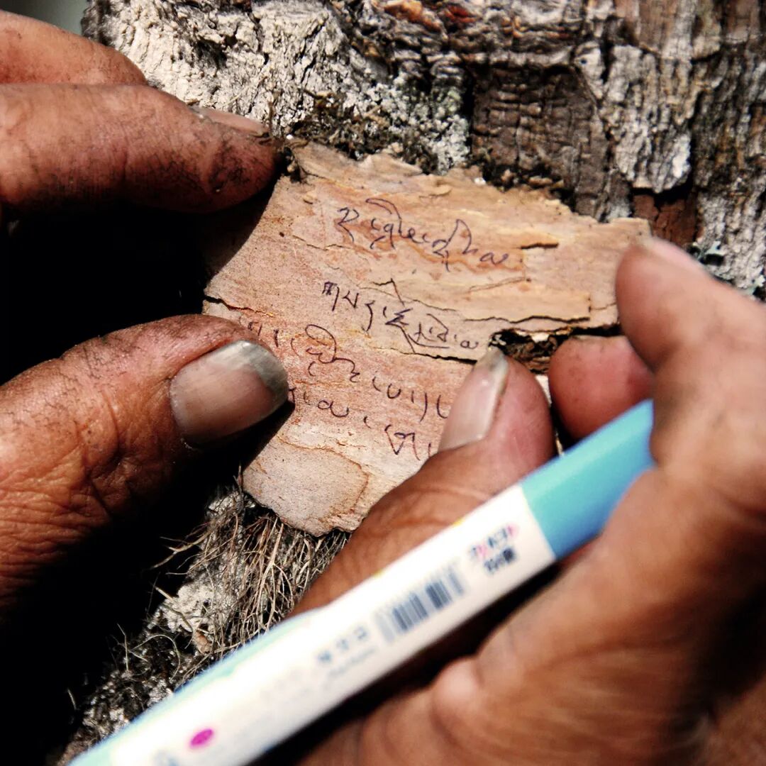 在第二天的行进过程中,阿旺捡起一块树皮,写下我们四个人的名字,卡在一棵树上。这是乙方负责人对项目前景看好的表达吗?