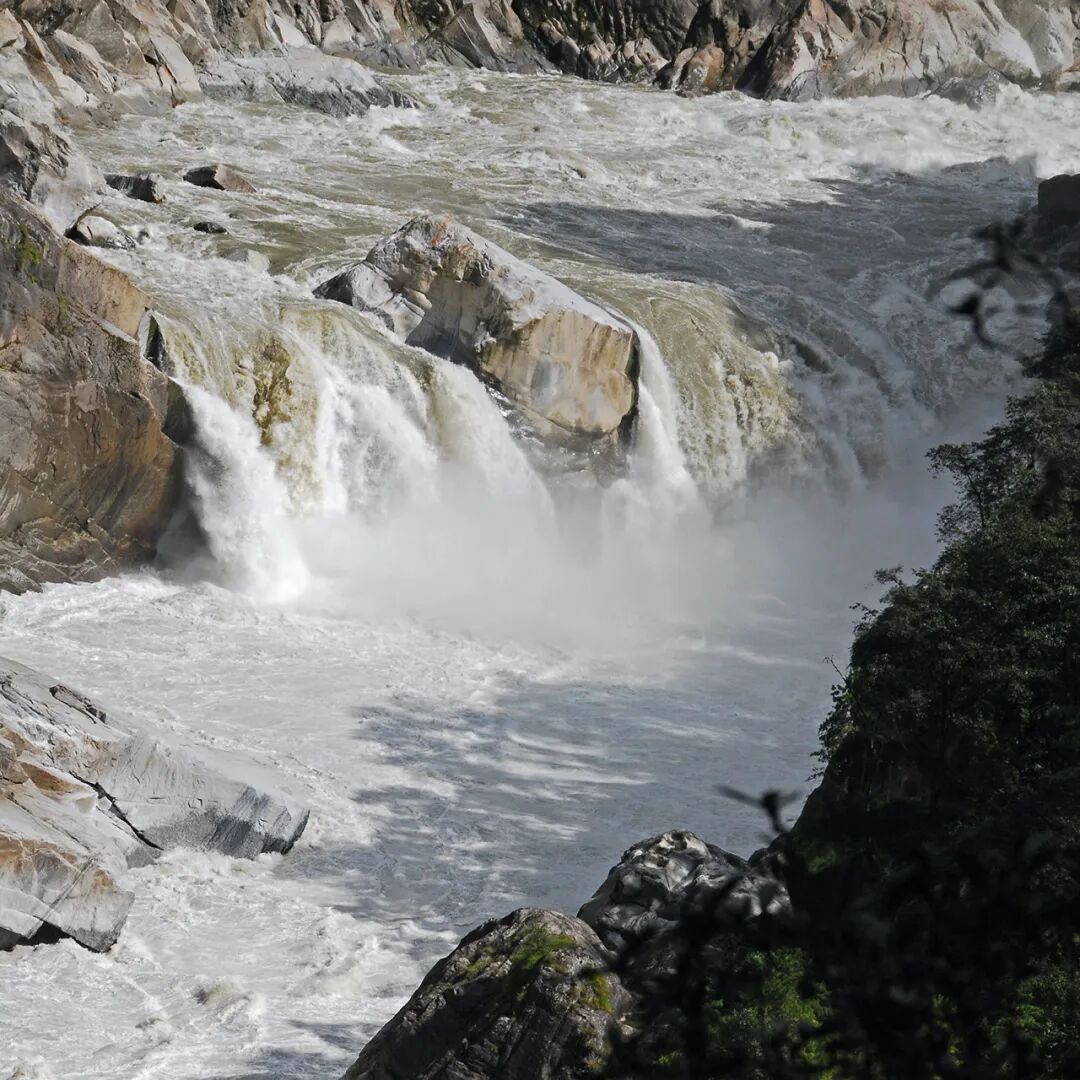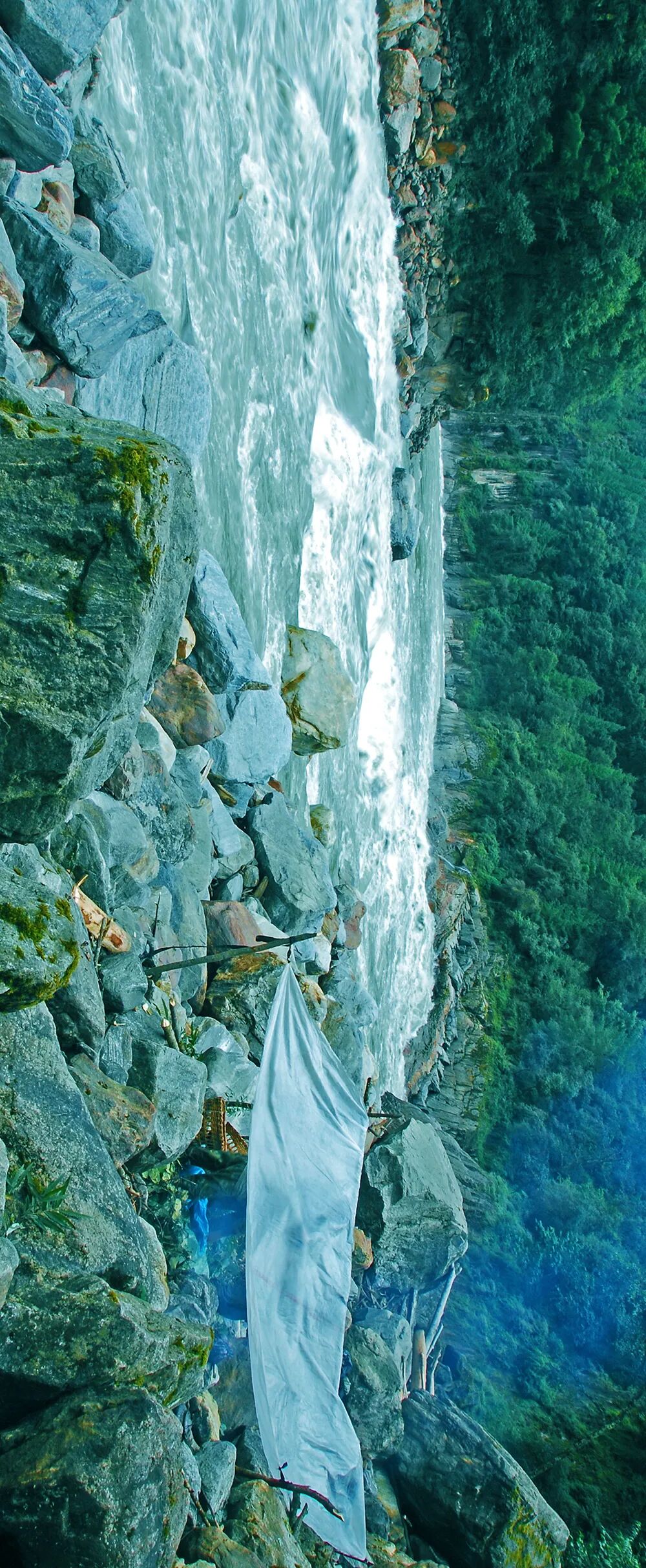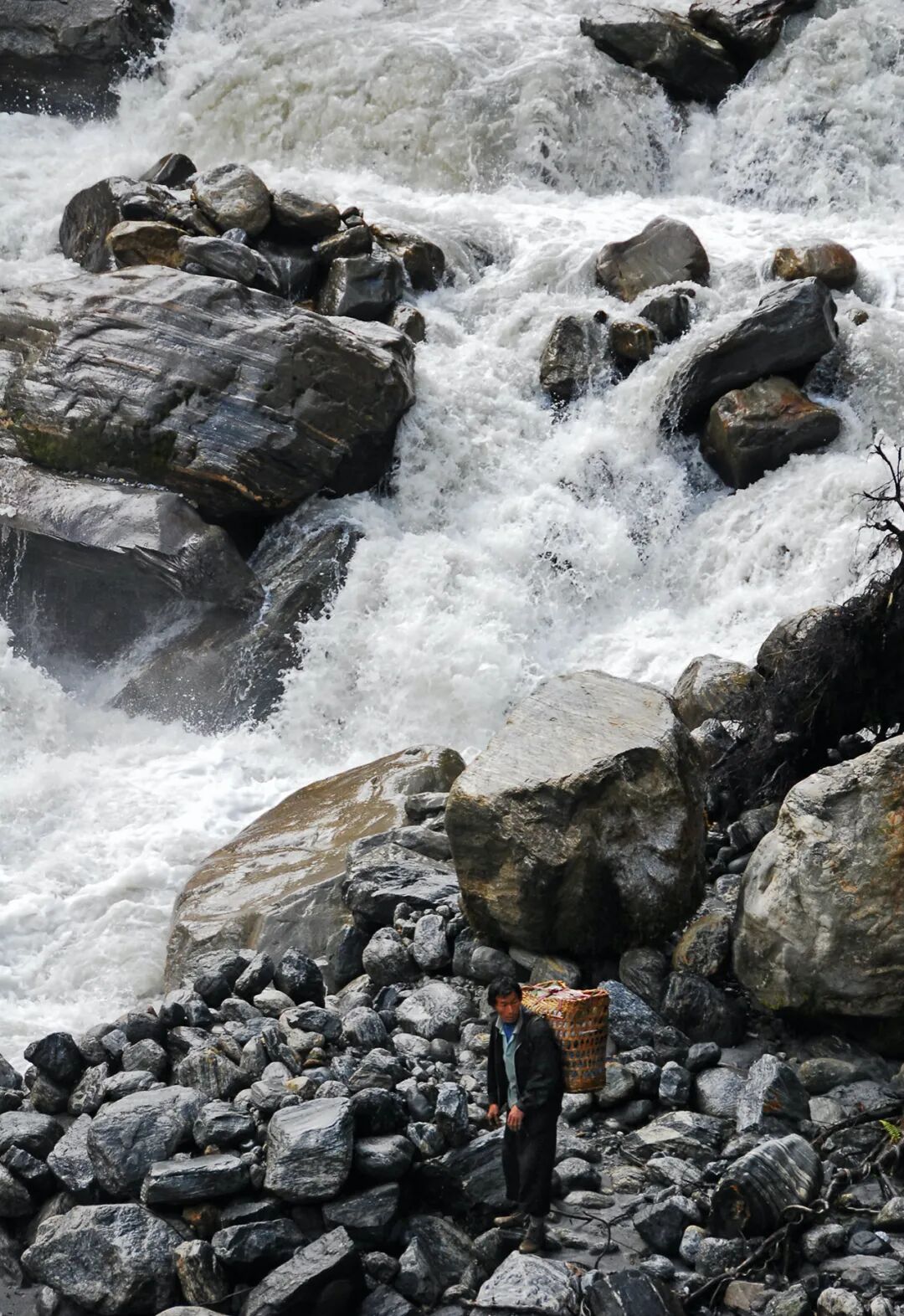 绒扎瀑布就藏在谷底角落的尽头。需要翻爬巨石,顺着基岩纹理,来到横亘水中的一块花岗岩上。雅鲁藏布在此再度急速收缩,山呼海啸地冲击着窄岩。深入水中的花岗岩颤颤巍巍,有一种三岁小孩横刀堵截千军万马的游戏感。站在上面人,也不能细想太多。脱了鞋子,穿着袜子,手脚相扶,如履薄冰。