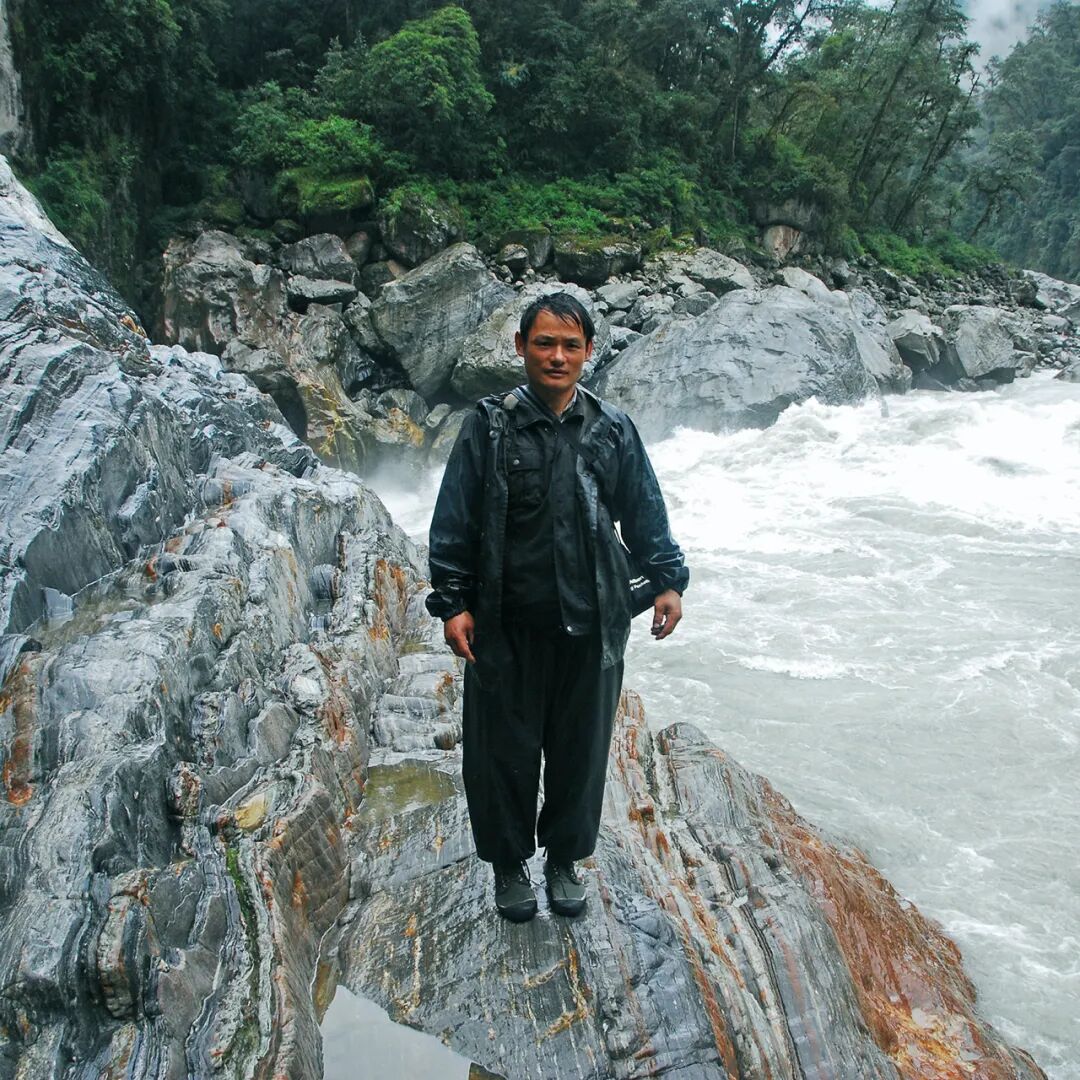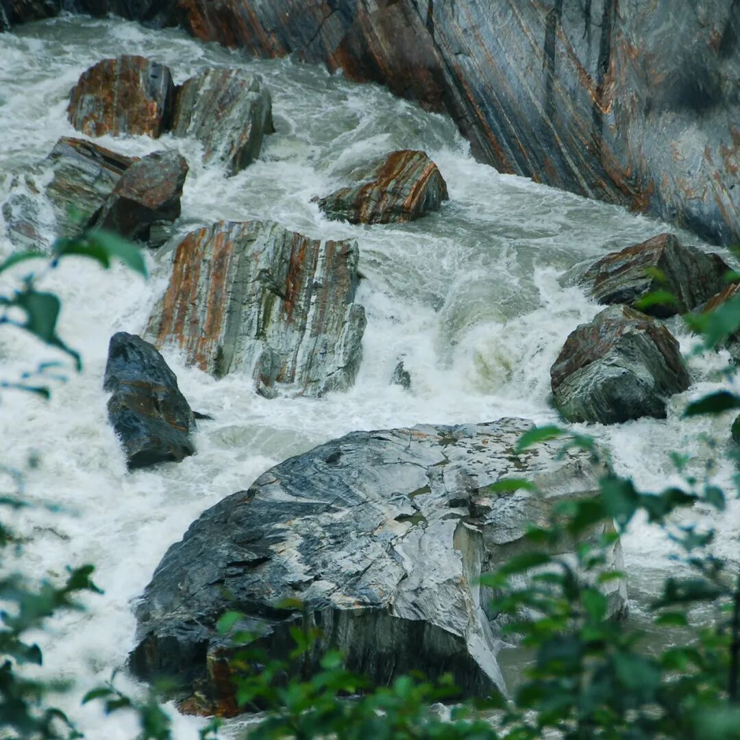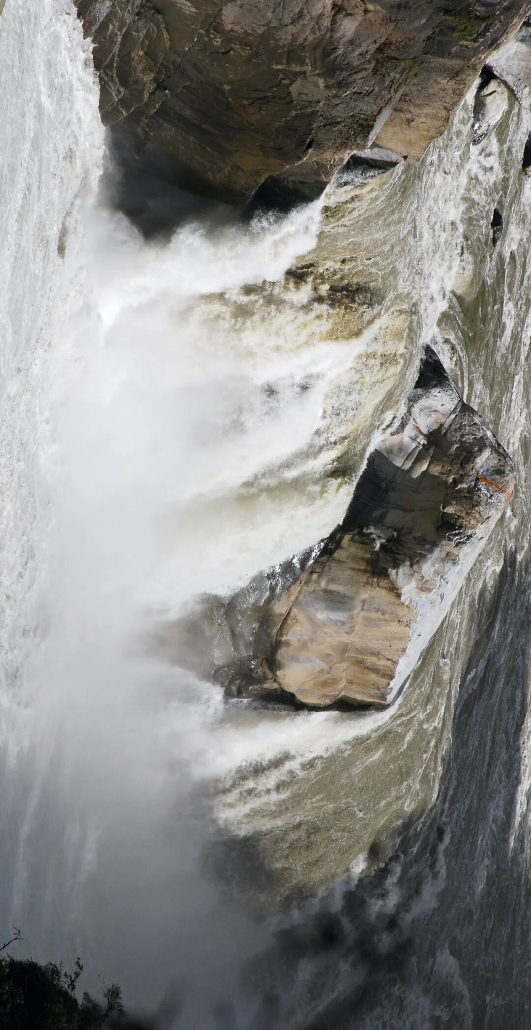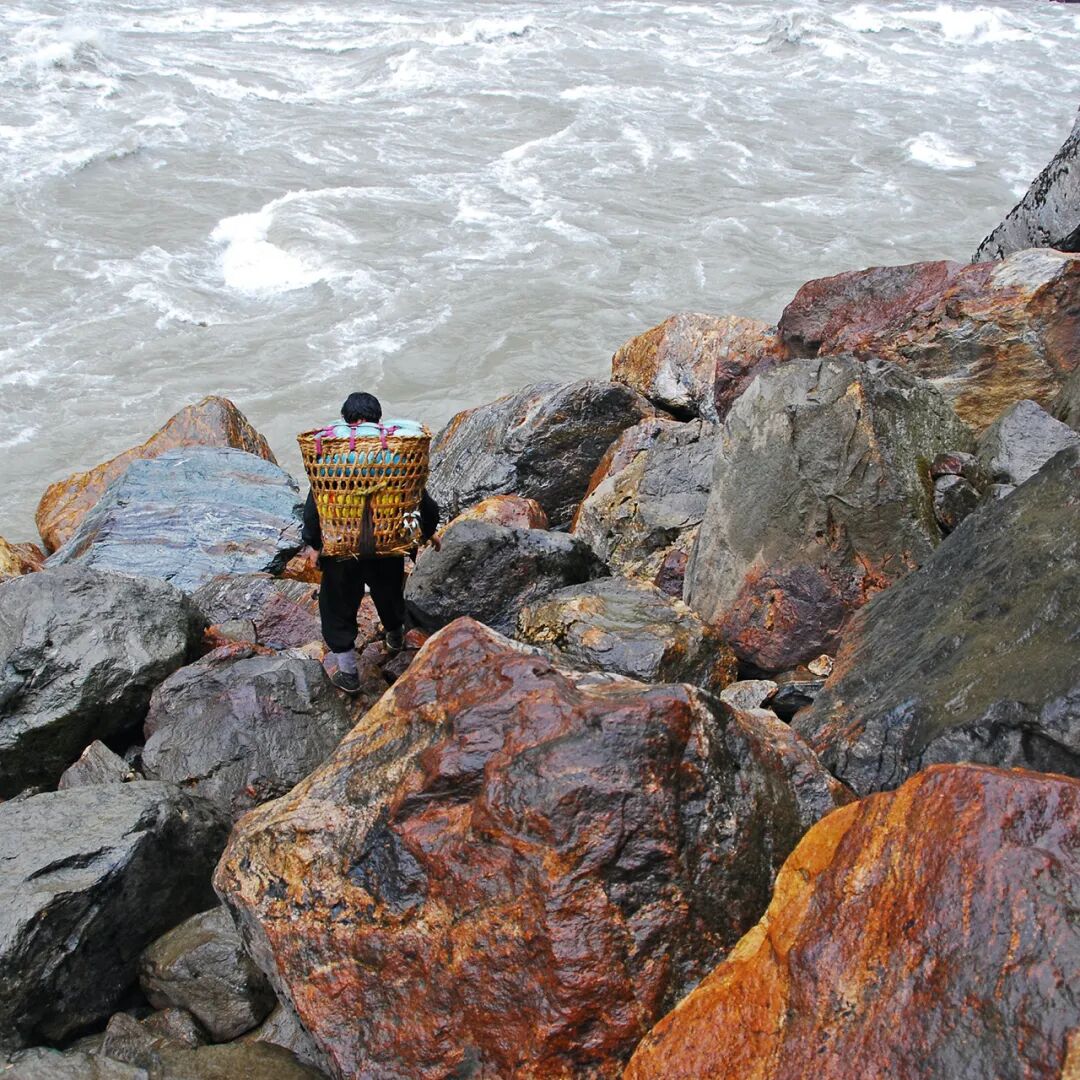 绒扎瀑布就藏在谷底角落的尽头。需要翻爬巨石,顺着基岩纹理,来到横亘水中的一块花岗岩上。雅鲁藏布在此再度急速收缩,山呼海啸地冲击着窄岩。深入水中的花岗岩颤颤巍巍,有一种三岁小孩横刀堵截千军万马的游戏感。站在上面人,也不能细想太多。脱了鞋子,穿着袜子,手脚相扶,如履薄冰。