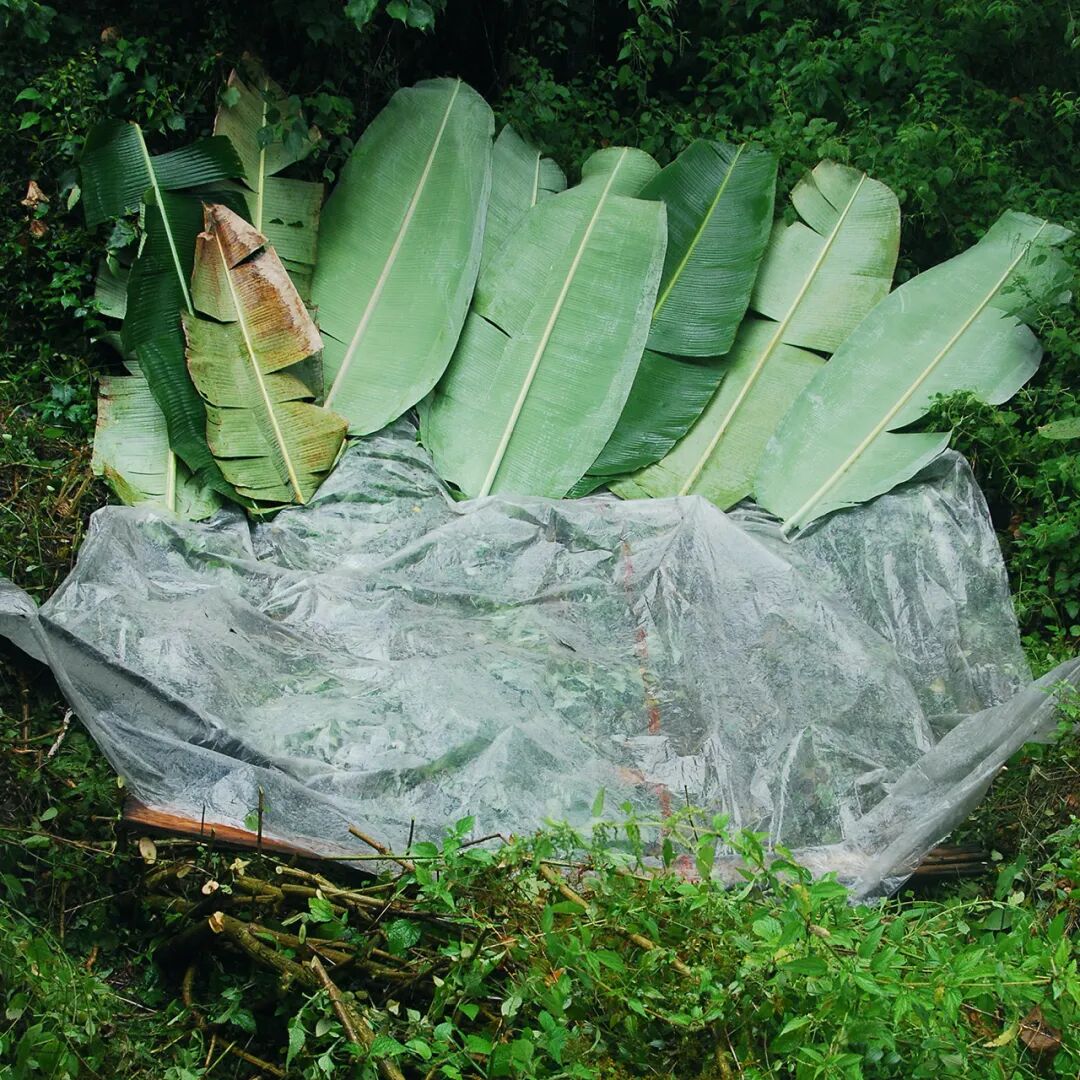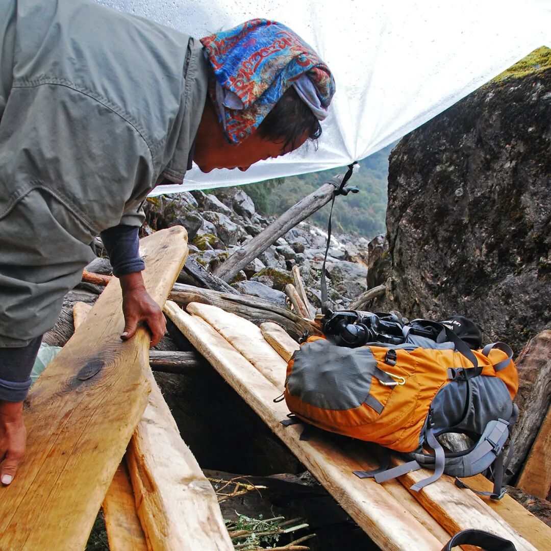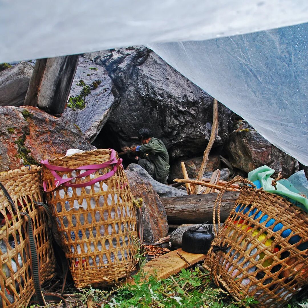 晚上露营,他们三人共享一块塑料布做屋顶,然后砍一些松软枝条垫在地上,铺上毯子,各盖被褥。我带了一个通道式小帐篷,只用过几次,多数时间和大家挤在一起。复杂丛林中露营,岩壁下,山洞里,简单的搭建,依然是最优的选择。