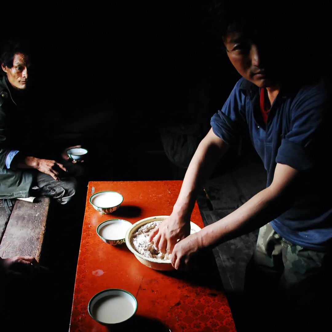 老巴弄来一根野菜,伴着布袋抖落出的糌粑粉熬了一锅汤。