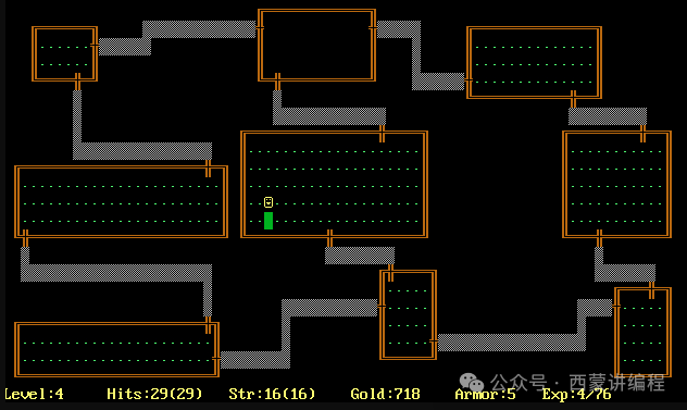 据传Roguelike这个术语是在1993年前后,USENET新闻频道的游戏玩家讨论区被使用的,最后就统一起来了。下图是在1980年的游戏《Rogue》的随机地图: