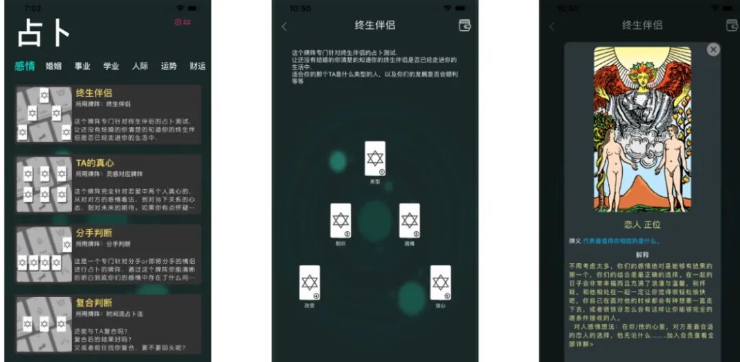 App 方面,做塔罗牌、星座运势等的开发者真的不少,不过目前我发现,同时精通产品、玄学领域知识、精通民俗文化且解决精美的视觉设计问题的开发者,确实很少,所以市面上的产品,总体专业度一般。