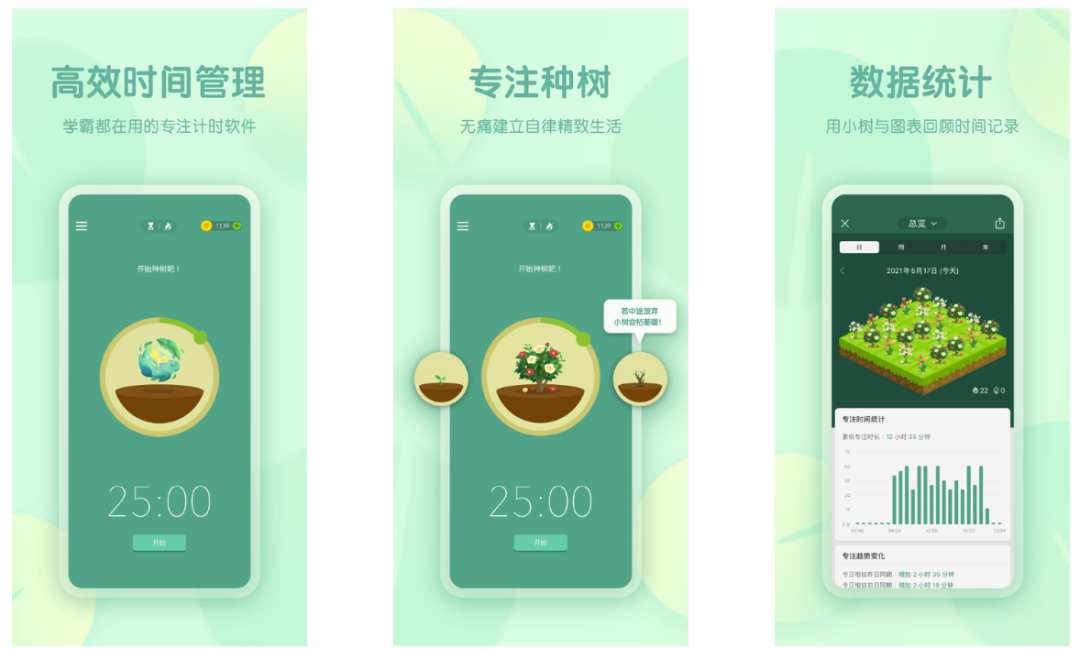 这里,罗列几个代表性的 App。概念都一样,用户负责专注,App 负责产生专注过程中的虚拟过程价值,让专注工作和学习和某类养成的乐趣结合起来,譬如说,种树。其实,这也可以说是工具游戏化的一种形态。