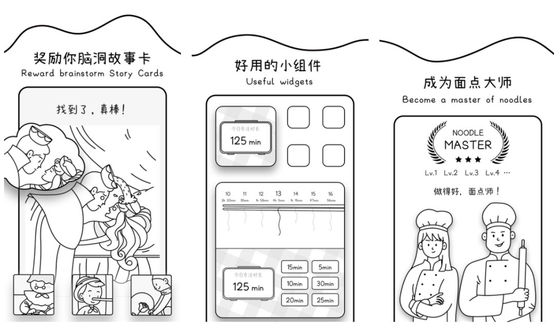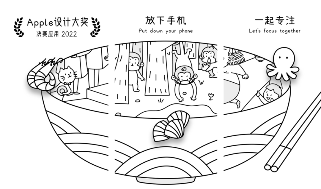 当用户选择专注时,想象手机成为盖泡面的盖子,盖上大碗。当专注结束,一碗面就做好了。根据专注时间以及其它因素的变化,每次专注结束都能制作出不同的食物。
