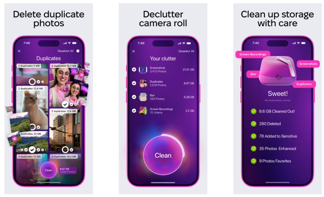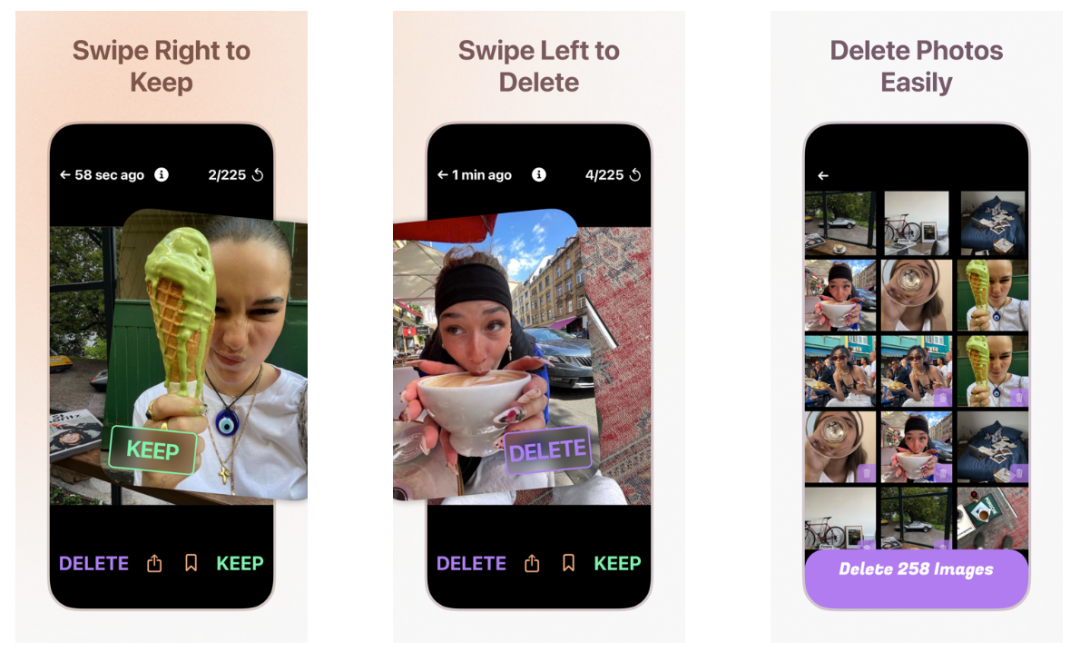 这款产品主打一个交互创新……其实不能说是创新,而是把别的场景的交互模式,用到了清理照片上,但是,这也是一种创新。