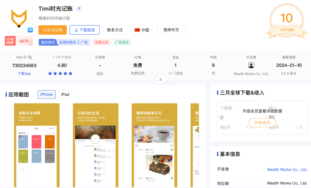 不过看这个 Timi时光记账,居然是 2013 年的产品,也是十年老品了,但即使迭代了这么多年,看起来用户量也谈不上多。
