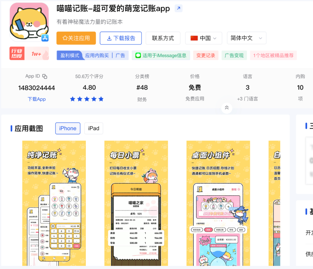另外,虽然是切开人群错位竞争,但是只要功能跟上来了,这类产品是有望超越第一阵营的产品的,目前从财务榜单上看,入行早还是重要的,如下面这款 2019 年入场的喵喵记账(财务榜48),应该用户量是相当可观的。