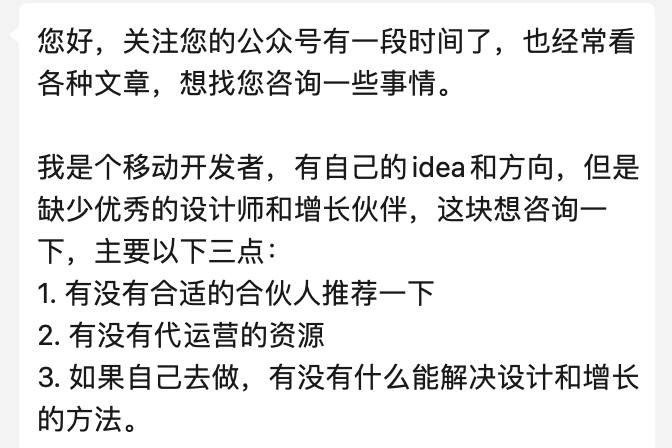 所以,问我问题的这个小伙伴,我说我真没有合伙人介绍给你,合伙人也不是找个公众号作者就能介绍来的,合伙这个话题,太重了,但我可以给你介绍合作伙伴,你们有的合作就找个短期内容合作下无妨,开发者多从合作伙伴做起,也多去找人牵线,能有这个思路,其实已经比很多独立开发走在前面了。(关于项目合作的方法论)