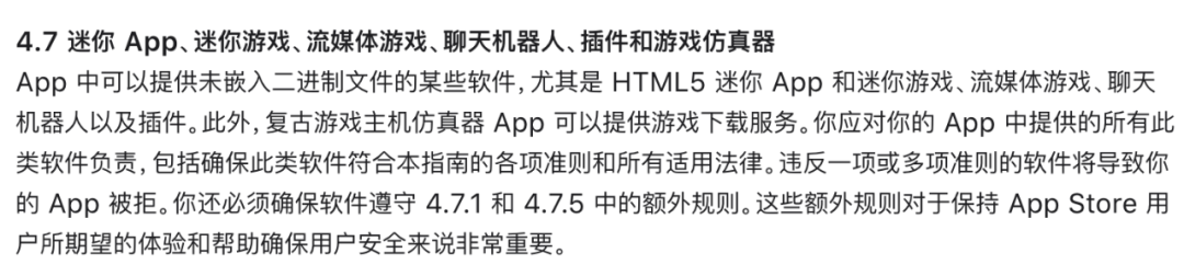 因为 4.7 虽然允许了 H5 游戏,但是也明确声明了,下发的游戏必须也要符合苹果审核条例。