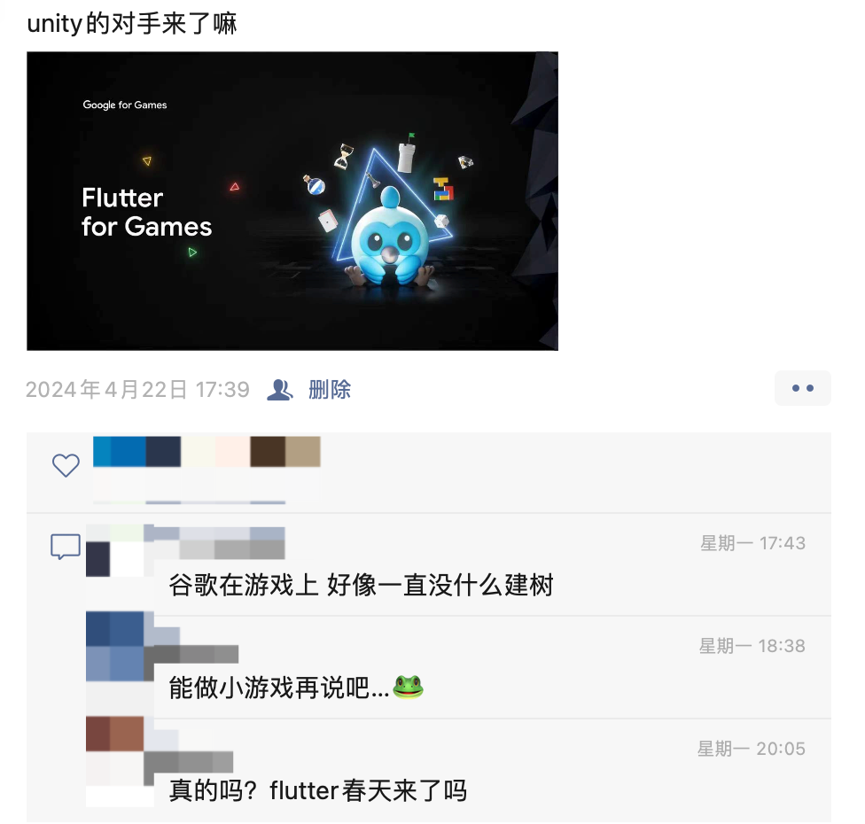 📝 Flutter 已经有了多年长足的沉淀,应用端用 Flutter 开发的 App 比比皆是,因为 Flutter 的渲染层是通过原生平台的底层做硬件渲染,这就注定了它具备支持高性能游戏的底层能力,支持游戏只要在原先的基础上搭建专用引擎即可。从技术角度来讲,用 Flutter 做游戏不太存在用新框架的风险。这和 SwiftUI 刚诞生时开发者的谨慎观望态度又不一样了。