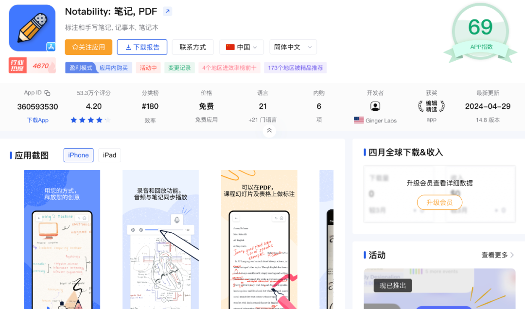 Notability 是一款老牌的付费应用,多年以来都是走付费模式(价格为约 60 元),直到 2021 年由付费改为免费+订阅制。