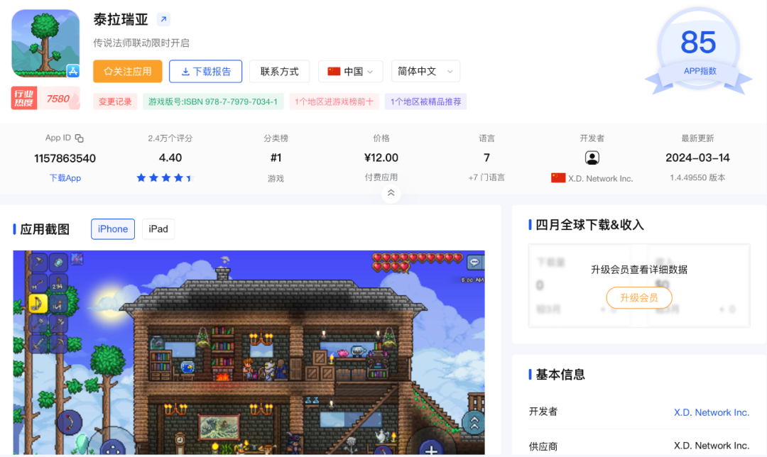 持续霸榜付费榜前十的像素开放世界游戏泰拉瑞拉,大陆区售价是 12 元,约相当于 1.99 刀。