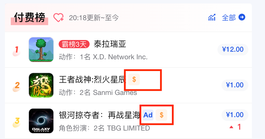 应用付费也可以作为一种产品发布的策略,如付费榜前三的第二和第三名,【王者战神】和【银河掠夺者】。