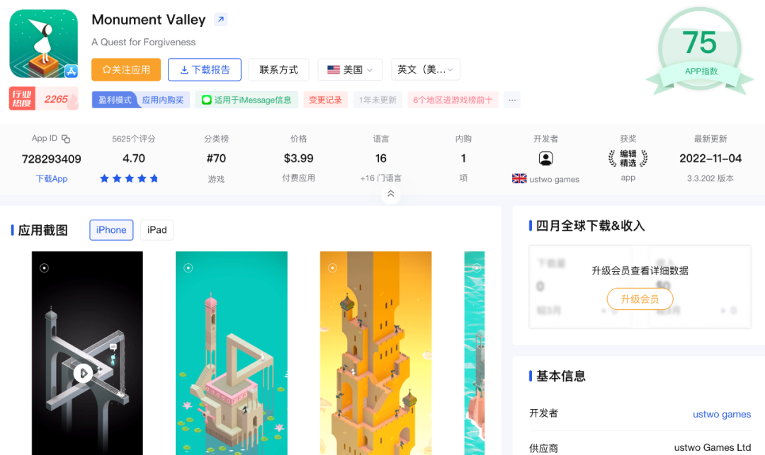 例如精品中的精品,纪念碑谷,它的价格也是堪堪 3.99 美元。