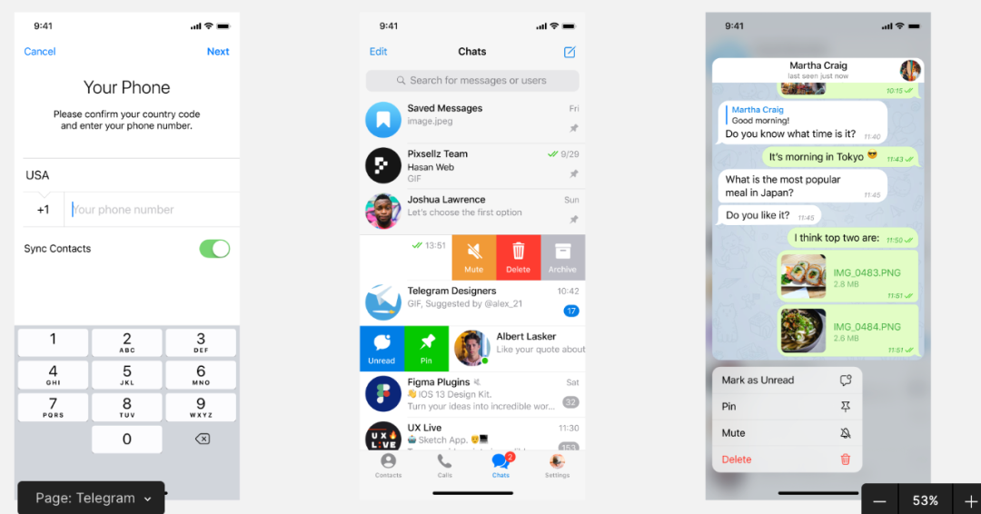 最好的参考学习对象依然是前一篇文推荐的 Telegram Messanger,现在版本的 Telegram 功能越来越多了,最好直接从 Figma 参考老版本的设计。