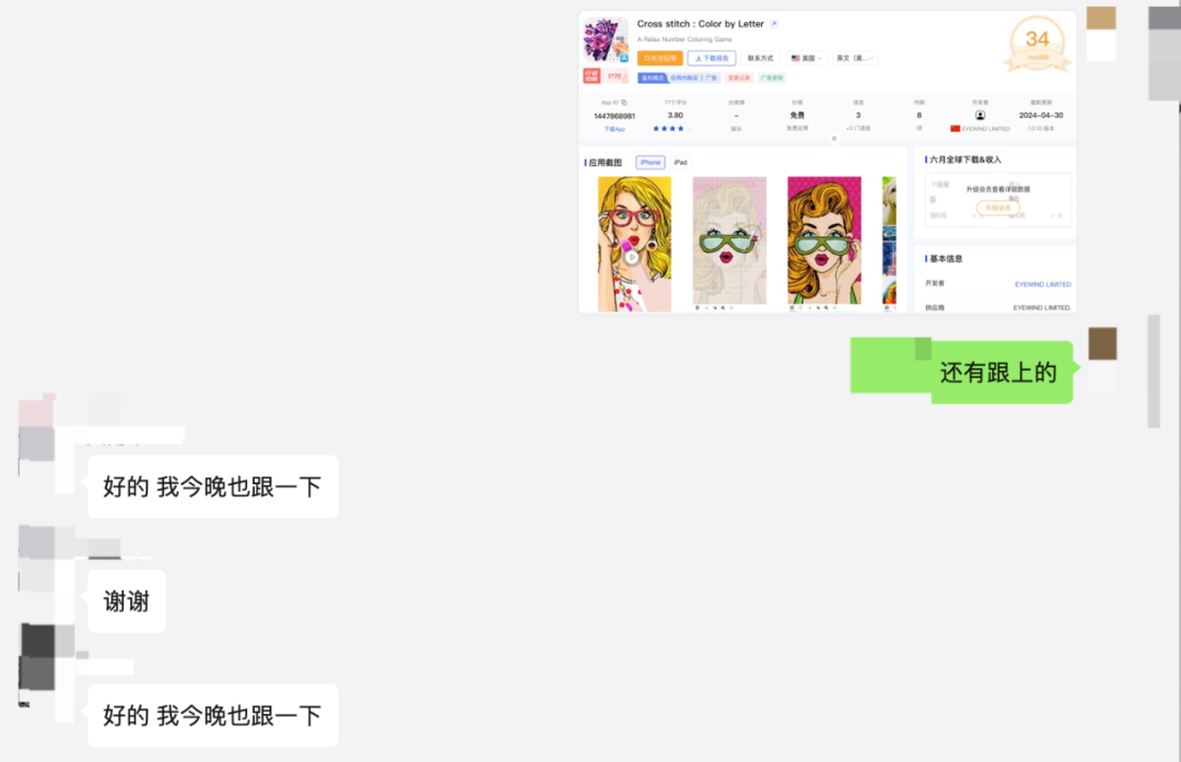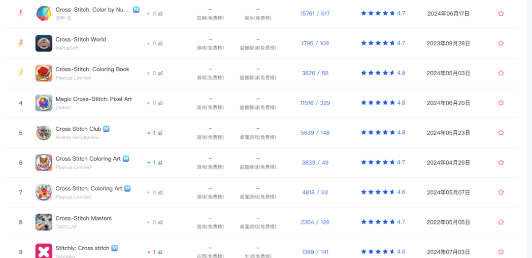 例如,stitch 目前有个最显眼包的跟风者,叫「Cross-Stitch: Color by Number」。但是,只有这家在跟着吃肉吗,没那么简单吧。这时候就要多考察几步了。参见下图。