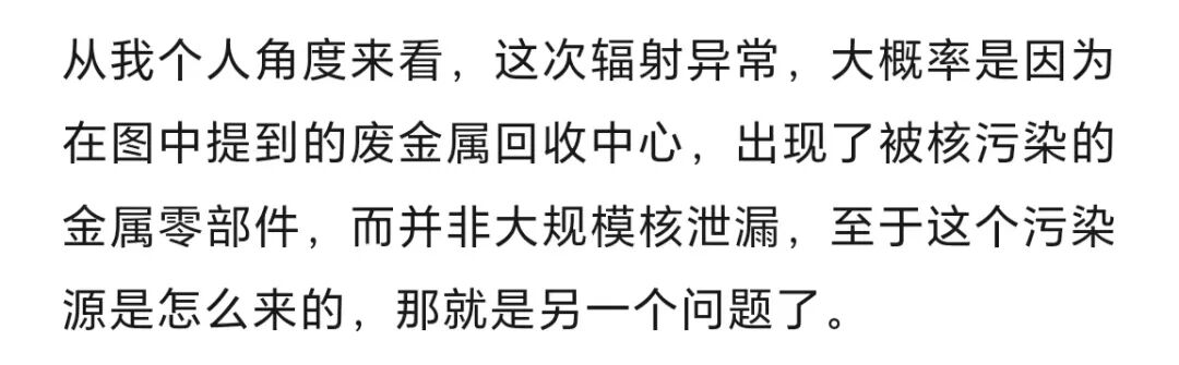 专业机构检测后确定,该辐射源系移动式探伤仪零部件,仅有半个火柴盒大小,可能为相关仪器转运期间遗落。辐射源被清理后,相关地区辐射值很快回归正常。