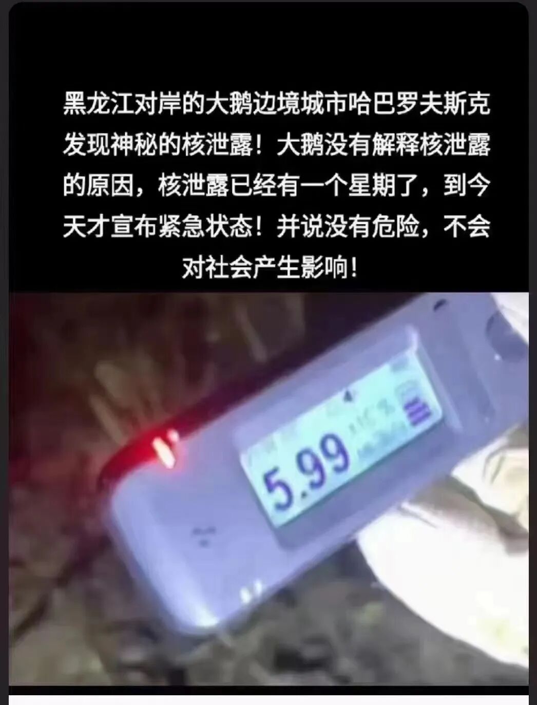 今天各个微信群里流传了一张照片,大意是靠近中国的俄罗斯边境城市哈巴罗夫斯克发现神秘核泄漏。