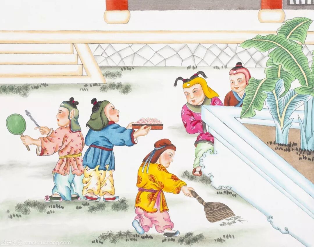 各处佛堂灶王前焚香上供,王夫人正房院内设着天地纸马香供,大观园正门上也挑着大明角灯,两溜儿高照,各处皆有路灯。上下人等,皆打扮得花团锦簇,一夜人声嘈杂,语笑喧阗,爆竹起火,络绎不绝。