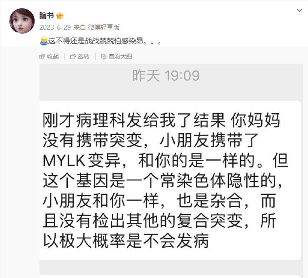 2023年1月,瞎书被诊断为巨膀胱-小结肠-肠蠕动综合征,全世界只有30几例。2023年6月,瞎书的女儿和她一样检测出携带MYLK异变,也是杂合。