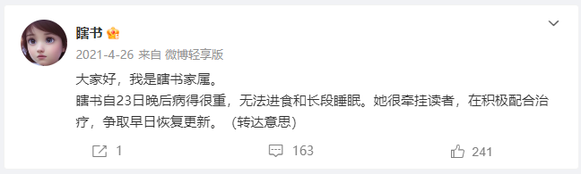 2021年4月,瞎书的家人透露瞎书4月23日晚突发重病,无法进食和睡眠,开始进入治疗。