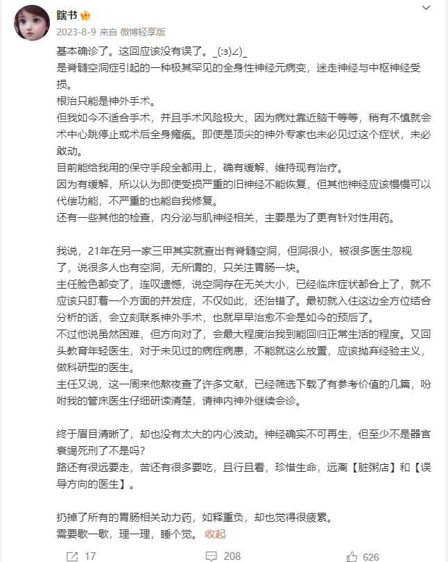 2023年8月最终确诊为脊髓空洞症引发的极其罕见的全身性神经元病变,迷走神经与中枢神经受损,而瞎书的身体状况已不适合手术,风险过大,只能选择保守治疗。