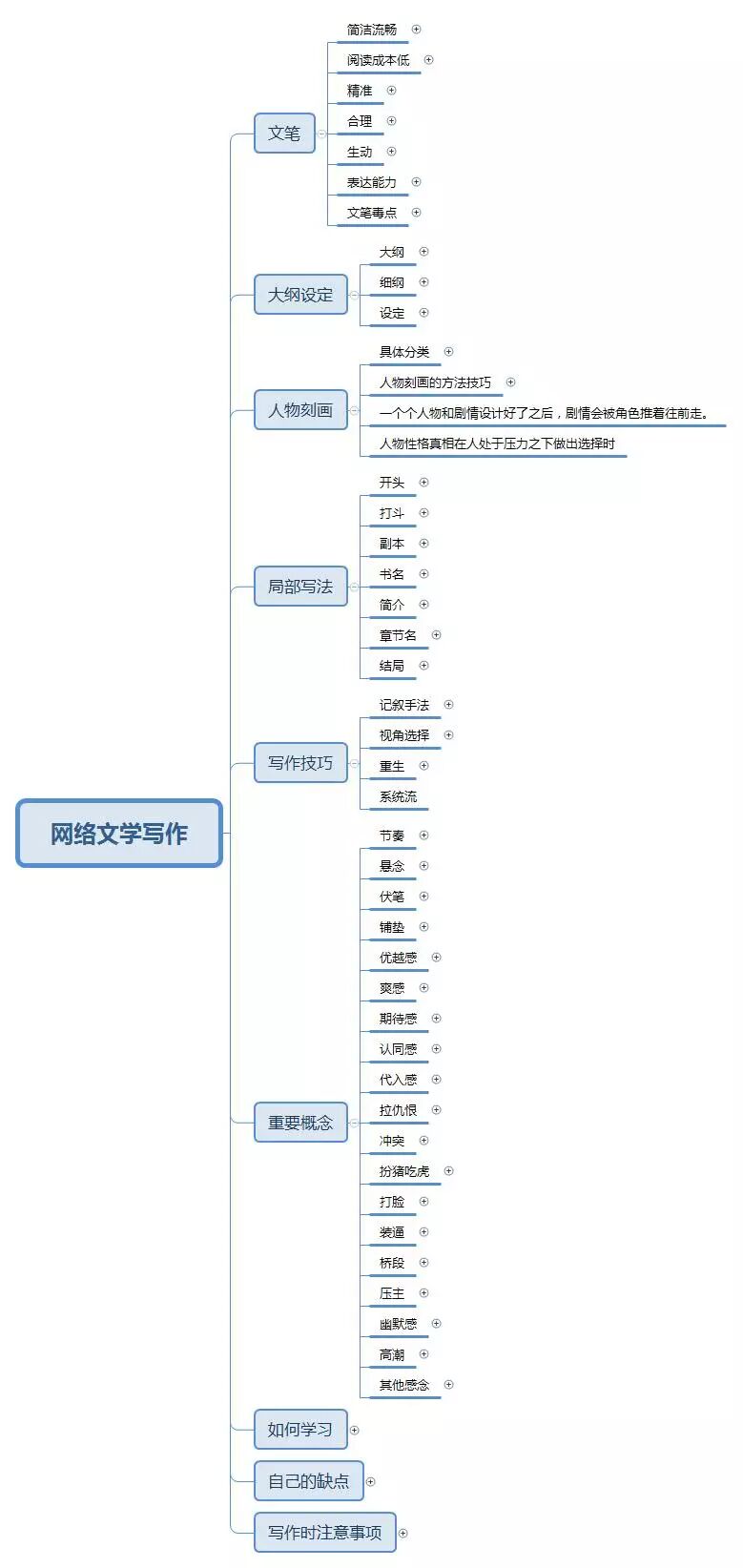 我用MECE法(也就是穷举法)对网文的知识结构进行拆分,拆分成文笔、大纲设定、人物刻画、局部写法、写作技巧、重要概念、如何学习、自己的缺点、写作时注意事项等几个大的子主题。